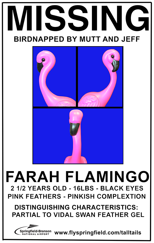 Little Farah Flamingo, the niece of Pinkley and Franchesca Flamingo, birdnapped in broad daylight from the airport lobby. Details are sketchy but airport police say everyone should be on the lookout for little Farah ... she's described as being pink, with pink feathers and a pinkish complexion. The only clue to her disappearance, police say, is this