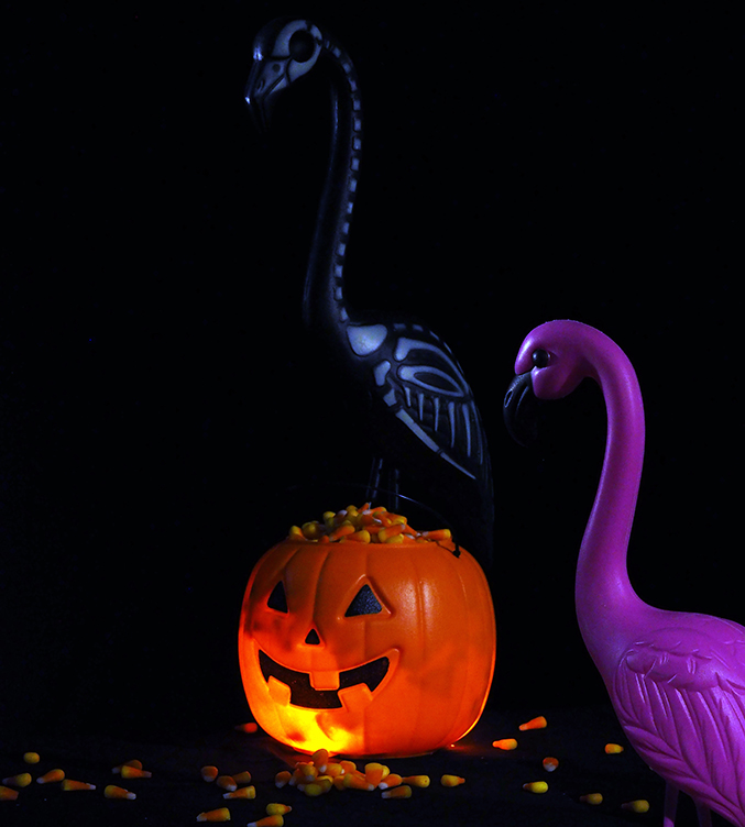 Pinkley Flamingo gazed with wonder at the glowing jack-o-lantern and its festive treats.