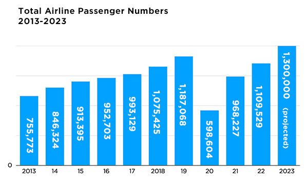 So far this year, passenger numbers are up ten percent compared to last year. If that pace continues, 2023 will set a new yearly record, with approximately 1.3 million total passengers. The airport’s last record year was pre-pandemic, in 2019.