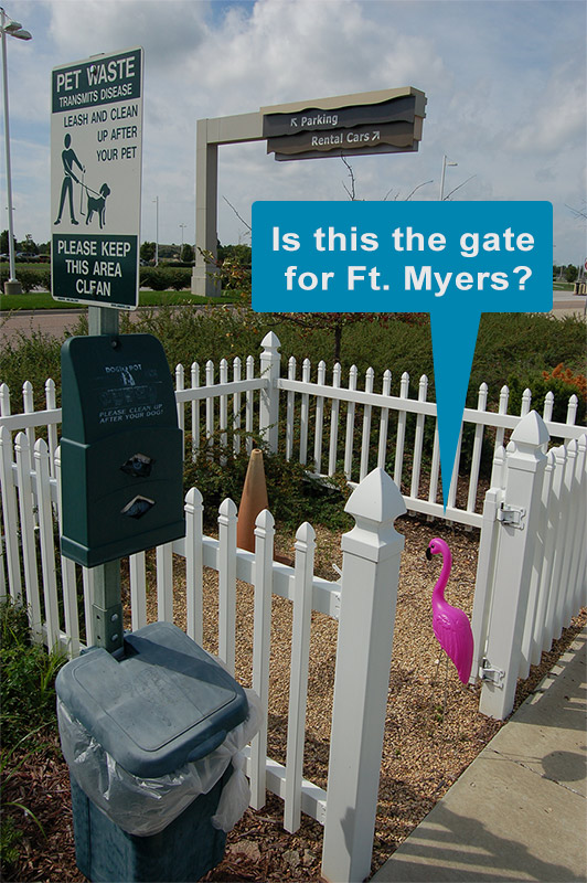When told that the gated area was not an airline gate, the pink fellow fussily flapped his wings in a huff and said, "I know that — I was doing an inspection! Fur cryin' out loud ... Can we get some lav service over here!!!"