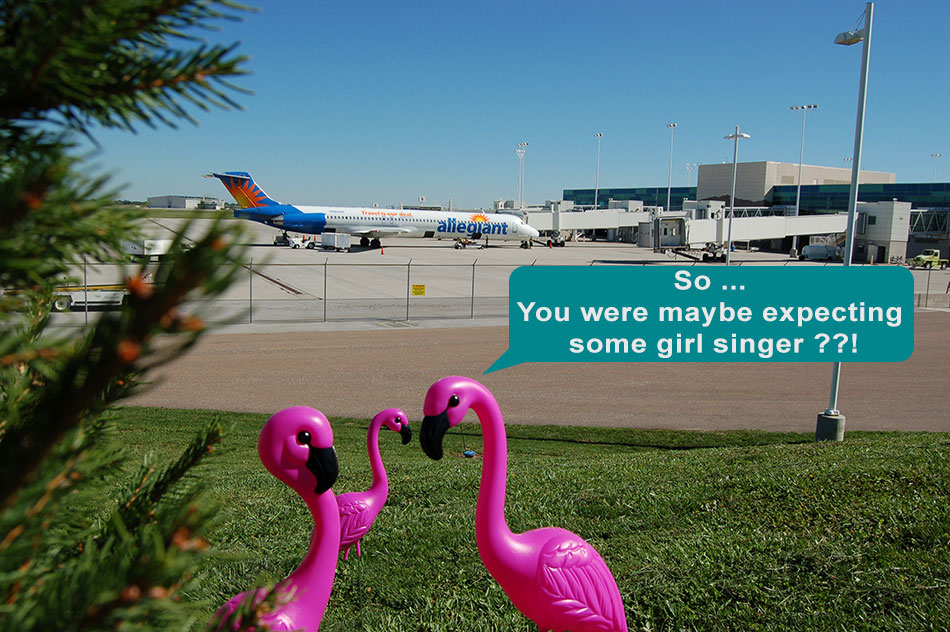 In a tizzy of anticipation the local flamingo flock is descending on our fair airport –– they want to fly home! They're in the drainage lagoons, crowding the taxiways — they're even in the terminal lobby –– no doubt about it –– a flamingo party will be well underway by the time the inaugural flight rolls around on October 31st!