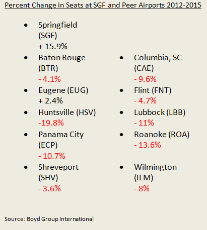 “This sort of growth is counter to what’s going on in the industry,” says Michael Boyd, SGF’s air service consultant. “When compared to airports of similar size across the country, SGF is by far one of the nation’s most prolific airports in terms of scheduled flights and seat capacity growth."